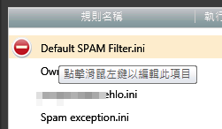 過濾規則 - 對新進郵件進行篩選及過濾。上圖中為預設規則。列表中的規則發生順序是由上至下。若其中某個規則因條件成立將該郵件做出「刪除」、「移動」、「延遲寄出」的處理時,後續的規則將不會再執行。